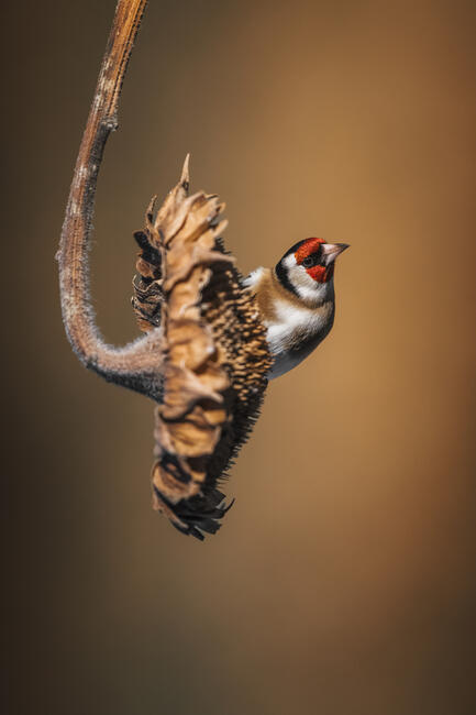 A European goldfinch (Carduelis carduelis) clings gracefully to a withered sunflower, its delicate form contrasting with the dried, curling petals. Suspended in perfect balance, the bird’s vibrant red mask stands out against the warm, earthy tones of the background. This moment encapsulates the seasonal cycle—life feeding on the remnants of the past, a quiet dance between survival and decay.