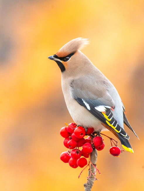 Ezeket a viaszszárnyakat fotóztam nem messze a Kremltől. Hűvös volt, és a madarak a hegyi hamuból jöttek táplálkozni. A háttér szárított sárga lombozat.