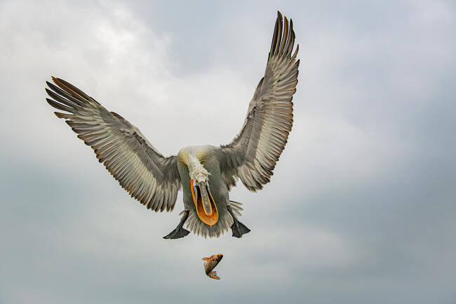 Kerkini tó, Görögország. Hajóval voltunk a vízen és körülöttünk néhány pelikán repkedett, ahogy kb minden vízi jármű körül arrafelé. Néhányuk hallal a csőrében küzdött a széllel (és egymással) és a pelikánoknak sincs mindig szerencséje... nekem annál nagyobb volt. Épen kiesett a hal a csőréből és próbált utánakapni.