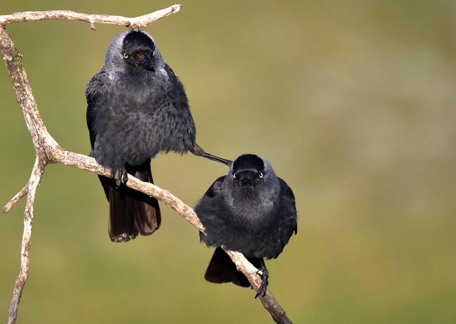 A csókák rendkívül érzéki módon udvarolnak egymásnak, a párok szoros köteléket alkotnak, csőrüket rendszeresen "csókolóznak". A pár egyik tagja gyöngéden a kedves nyakára helyezte a lábát, ezzel is erősítve a kapcsolatukat.