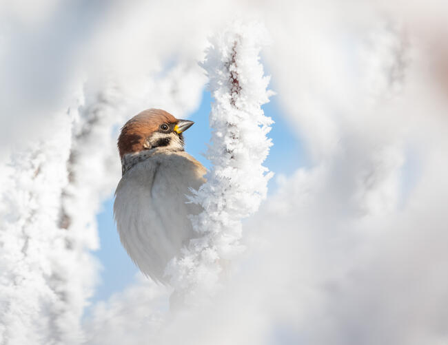 Sétáltam a fagyos januárban a kertben és messziről megláttam, hogy egy házi veréb hím a gyönyörű zúzmarás ágon örül a napnak és közben nagyon figyelmes. Nagyon óvatosan takarásban megközelítettem és reménykedtem, hogy a fény felé fog nézni és a sűrű ágak között a fejére világít a napfény.