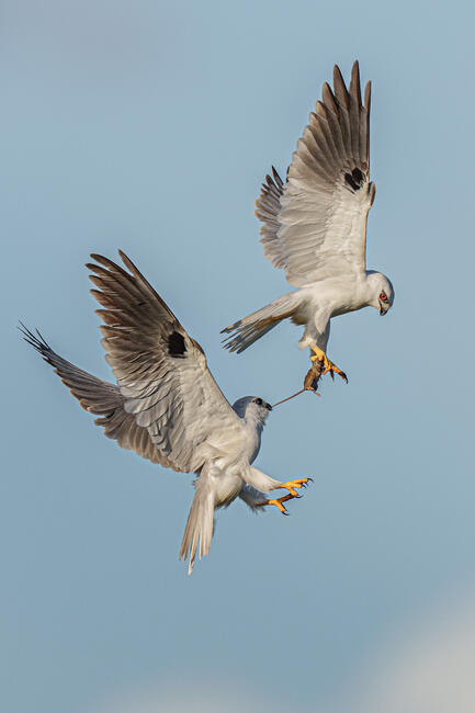 A pair of Black Shouldered kite is passing food mid air.