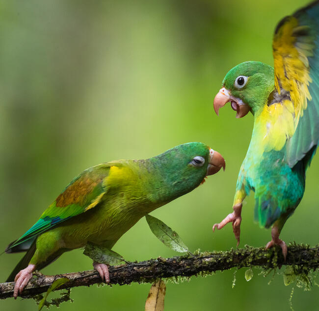 A csalinak kirakott banán vonzotta a madarakat, köztük ezeket a papagályokat, akik néha nehezményezték a másik tolakodó viselkedését.