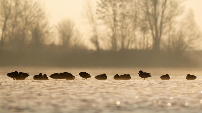 Ellenfényben kaptam az adandó alkalmon, a parton nem sokkal a víz szintje fölé helyeztem a gépet és fotóztam a lihogó mellett pihenő récecsapatot.