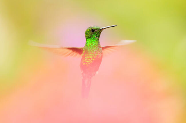 A hummingbird stands still for a fraction of a second while he stares at me before taking off in elegant flight towards another flower. the blurs of the flowers between us were just magical to show the splendour of his portrait.