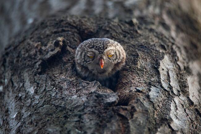 A pygmy owl peeks out of its hollow. Owls make pantries in winter - a supply of mice and voles. They put their prey one after another into the hollow. At the moment when the owl is about to fly out, he inspects the territory and you can watch for the owl while standing under a tree. This little owl blinked and it turned out to be a funny shot.