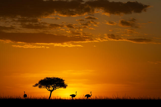 It was a beatiful sunset in Africa, luckily a few ostriches appeared on the field, so it was taken lying on the ground, getting a good setting of clouds, tree and birds