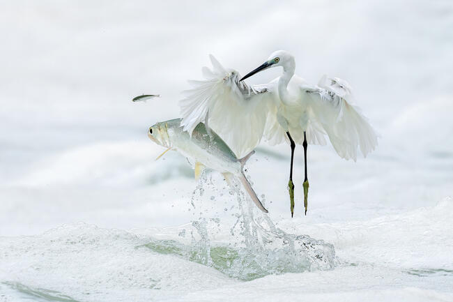 The big fish chased the small fish and rushed out of the water together, passing the egret. The egret looked surprised and did not know where the small fish would go under the laws of nature? Just like a poem: I pass by you, you come in a hurry, and before I realize it, you have gone far away, leaving me with a regretful back. Capture storytelling moments through high-speed continuous shooting. Taken in Xiamen Yuandang Lake, China in September 2022.