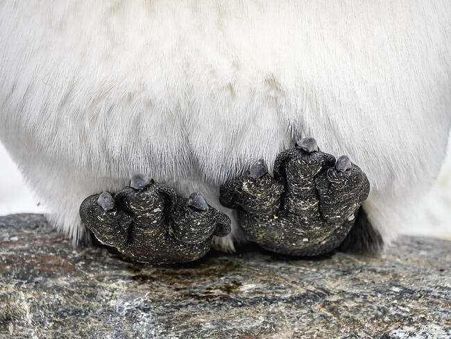 In this spectacular location, I looked for some small details of the penguins to photograph. This King Penguin was quietly balancing on a rock. The position of its feet framed above by a curtain of white feathers drew me in.