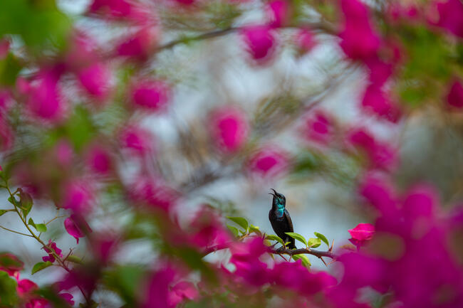 I spotted a purple sunbird perched on a cluster of pink paper flowers (*Bougainvillea glabra*). These flowers secrete nectar that attracts pollinating birds like the sunbird. It paused several times, and I used the bright pink flowers in the foreground to make the picture more colourful and vibrant.