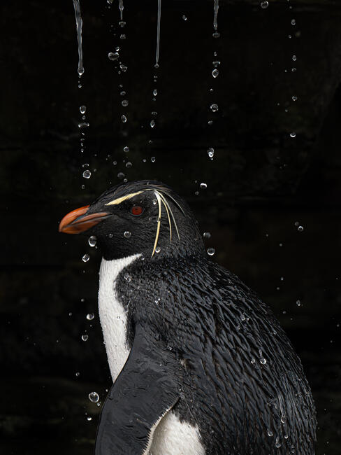 There is a place on Saunders Island in the Falklands where freshwater originating in a spring cascades down over a ledge. Rockhopper penguins returning from a day at sea fishing like to rinse the saltwater off their feathers before ascending up the steep cliffs to their nests. There were many penguins and they were continually fighting over the rights to the shower. I waited there for nearly two hours on a narrow ledge but I finally got a single individual under the shower at a good angle.