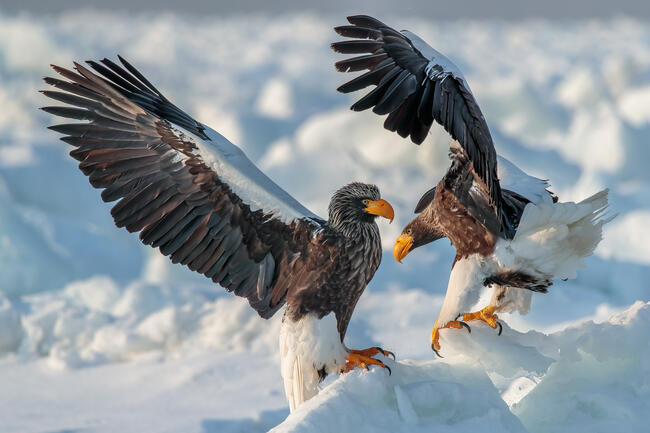 I took this photo in Rausu, Japan, on a drift ice boat.It was very cold as we headed out to shoot at 6:00 in the early morning in the middle of winter.A couple of Steller's sea eagles were spreading their wings and frolicking as if they were dancing.I photographed Steller's sea eagles because they are so noble and cool.