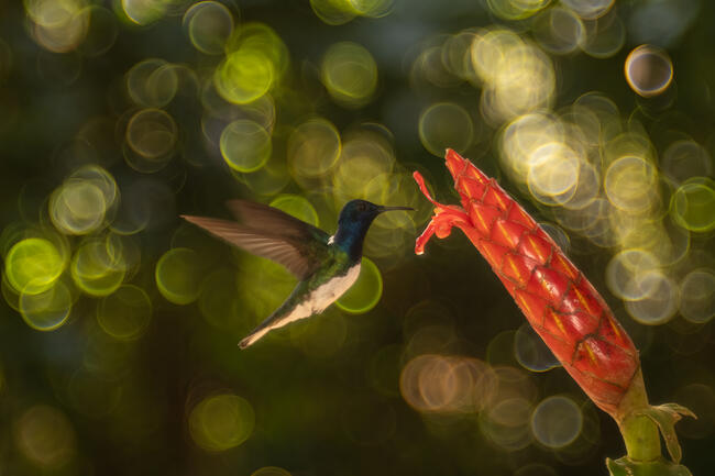 Egy jakobinuskolibri issza a nektárt egy szivarnövényről. A kép manuális optikával készült.