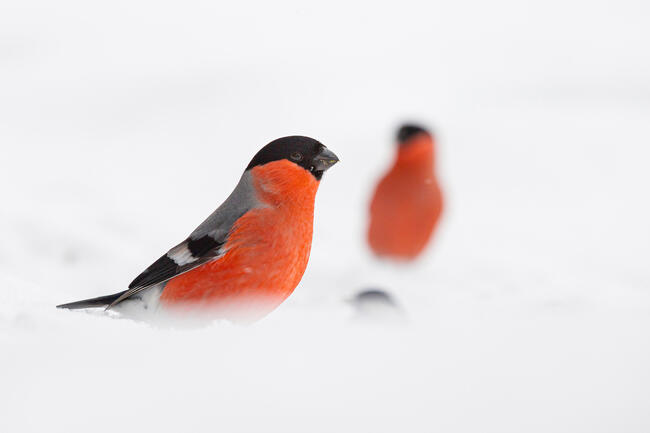 I've been dreaming of taking pictures of these red-breasted beauties for a long time. A friend reported that bullfinches are fighting on the feeder. The shooting was done from scratch. In the photo, there are two bullfinches and one chubby one, a brown-headed nut is superfluous.