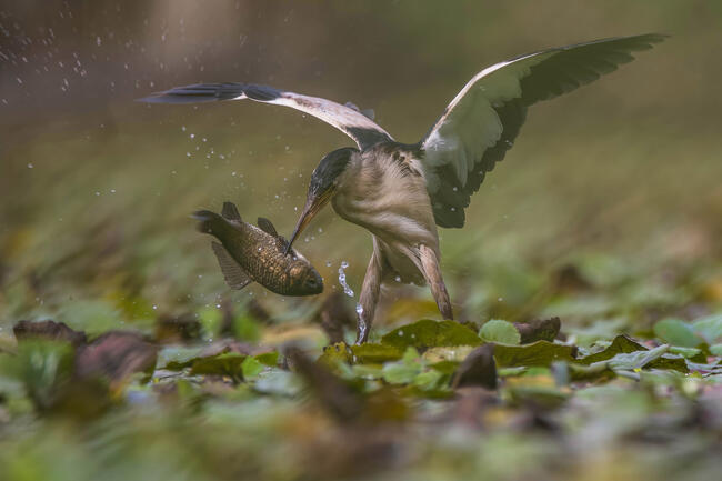The photo was taken on one of the ponds, which is overgrown with chilim every year. Little bitterns and various herons take advantage of this, as the fish are forced to float to the surface of the lake and stick their heads between the chilim bushes to breathe. Birds such as the Little Bittern simply walk on this green carpet, as their weight is small. Sometimes they freeze and wait for their prey for a long time. This time, a fish too big for a bittern leaned out - the bird missed it.