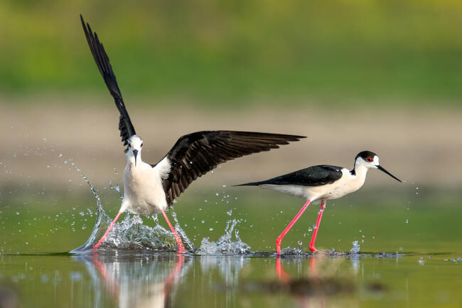 Near the town of Dedoplistskaro, there is a convenient lake for photographing waterbirds. In the spring, during migration, a large number of stilts stop there and apparently form pairs at the same time. The process is accompanied by fights among them all. I arrived early in the evening, set up a small hide, hid in it, and within 20 minutes, the stilts started returning to their spots, making it possible to photograph them.