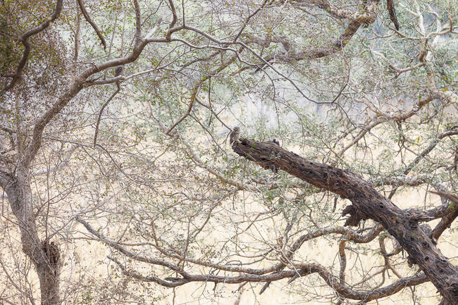 A spotted owlet rests amid the chaos of branches. It's a photo with a secret — if you look closely, you’ll find a second bird hidden in the frame