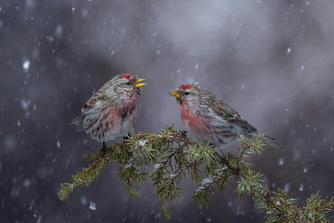 Snowfall during shooting does not often please the photographer, but if it happens, it brings a lot of pleasure and enlivens the photo. Very soon these males will fly into the tundra to their nesting territories and will sing mating songs, but so far this snowy April day you can only dream about it. I got this frame during the spring migration. I used flashes.