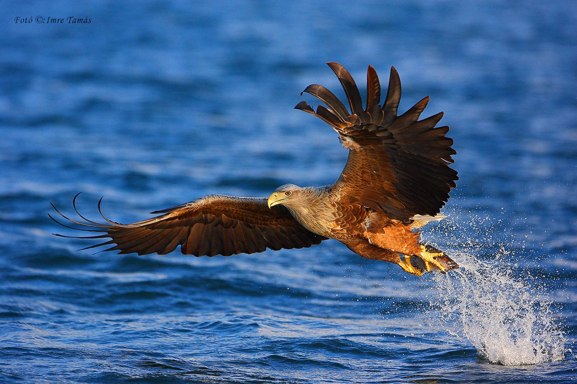 IT: Még 2010-ben egy norvég fjordnál jártam. Ott nagy gondot fordít egy norvég férfi arra, hogy a sasok az emberektől háborítatlanul éljenek, erőfeszítései eredményeképpen úgy 30 pár madár élt akkoriban a területen. Az év egy részében arrafelé nem megy le a nap. Ilyen időszakban jártam ott, pontosabban júniusban. A fotó éjjel fél egy tájban készült, a különleges fények, a tenger vizének élénk, telt kék színe ennek köszönhető. A madarakat motorcsónakkal közelítettük meg. Egy jól elkapott fotóért sokat kell kihajózni, keményen kell tartani magad a hullámzó vízen a hajóban. Ez a kép is a nyílt tengeren készült, szerintem legalább 16-szor voltam kint, mire ez a kép sikerült. A vezetőnk a madarak odacsalogatásával segítette a fotósokat, negyedmagammal voltam a csónakban, táplálékot dobált nekik.