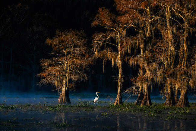 Several cypress trees stand in the marsh, with a stretch of deep blue water beneath. A thin mist drifts over the water surface. Egrets keep watch under the trees, guarding this peaceful and dreamlike world. Photo taken on November 23