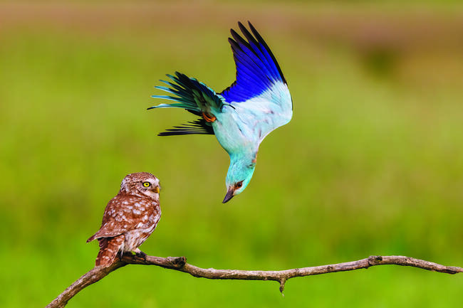 A kuvik és a szalakóta nagyon különböző madarak, de mivel odú- és táplálékigényük is nagyon hasonló, konkurenciát jelenthetnek egymásnak. A baglyot nem különösebben zavarná színesebb társbérlőjének közelsége, a szalakóta hímje viszont nem bír a hormonjaival és a revírfoglalás rövid időszakában sportot űz mások idegesítéséből. Lesből, teljes sebességgel repülve, hátuk mögül próbálja meglepni a területre tévedő madarakat, bármekkorák is legyenek azok. A fotó a saját építésű lesemből készült.