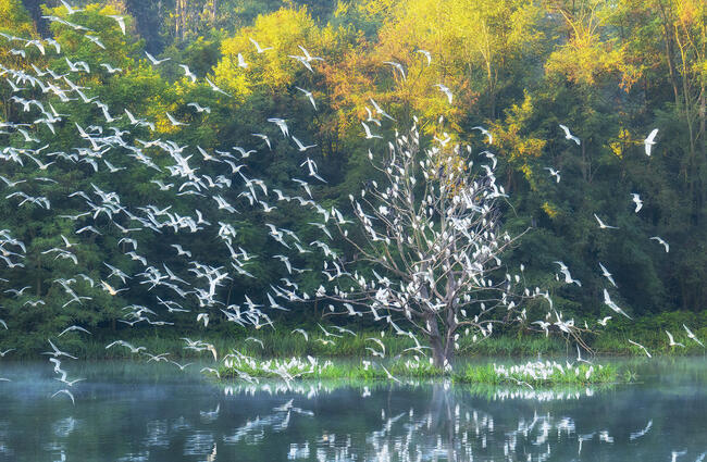 Towards the end of August hundreds of cattle egrets gather above the trees at dusk and then take flight again in the early morning.